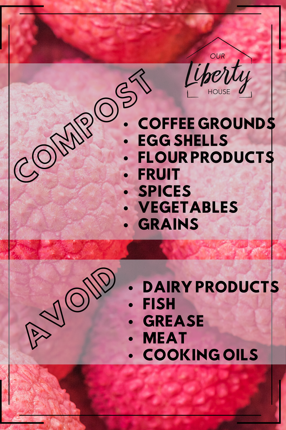 A: For quality compost you want a mix of green and brown material. For us, our green material typically includes any vegetable or fruit scraps, coffee grounds, grass clippings and flower clippings. You do not want to compost meat scraps, hard pits like avocado and weeds.
